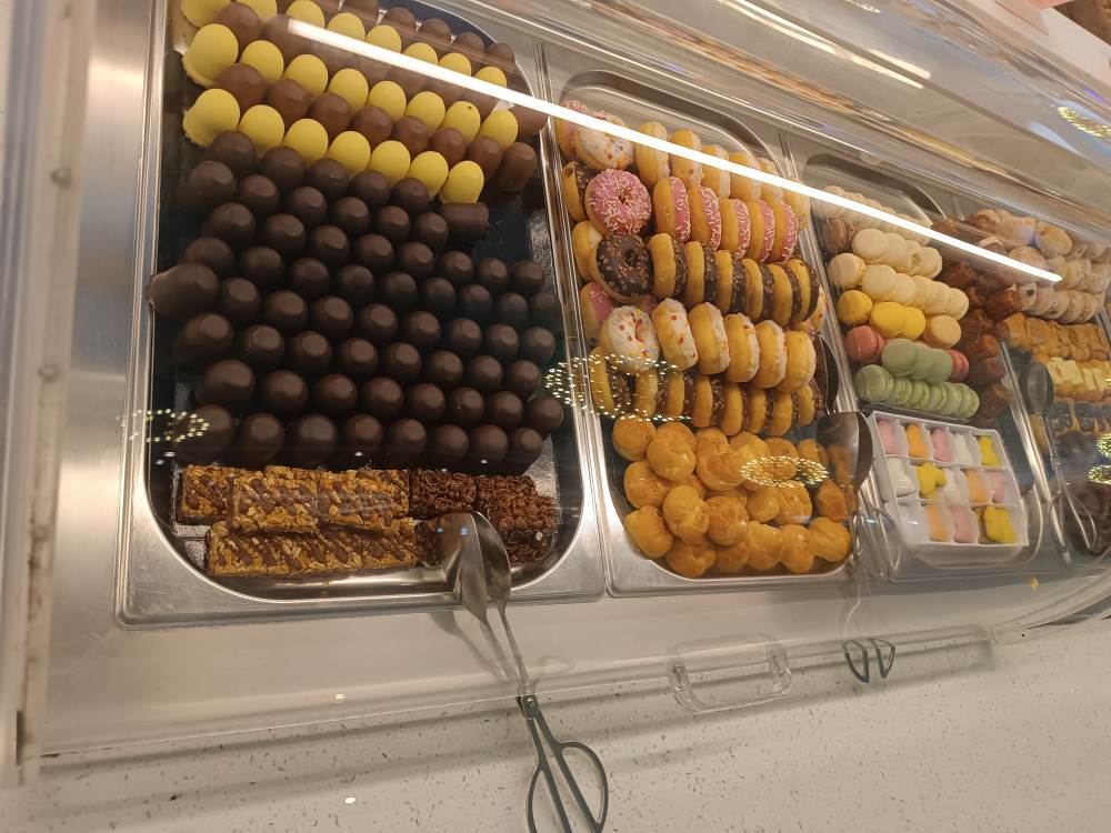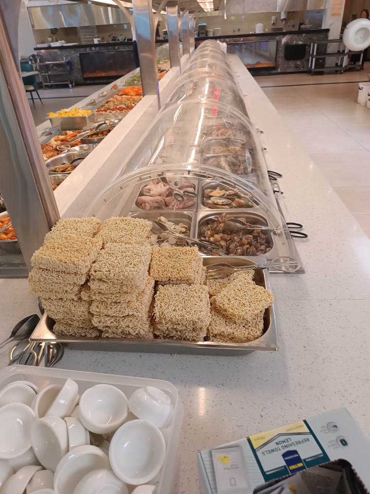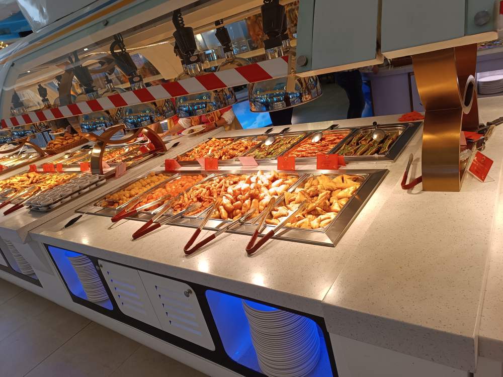 Das Büffet sieht zum Glück sehr appetitlich aus, nicht nach in Plastik verpacktem Flugzeugessen…