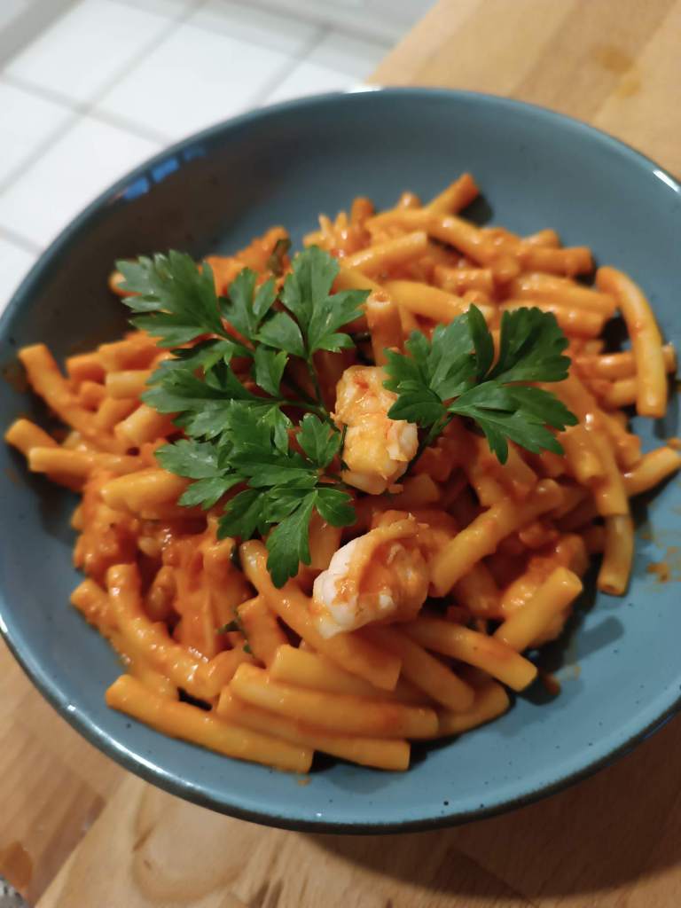 Makkaroni mit Crevettensauce (Crevetten, Halbrahm, gehackte Tomaten)