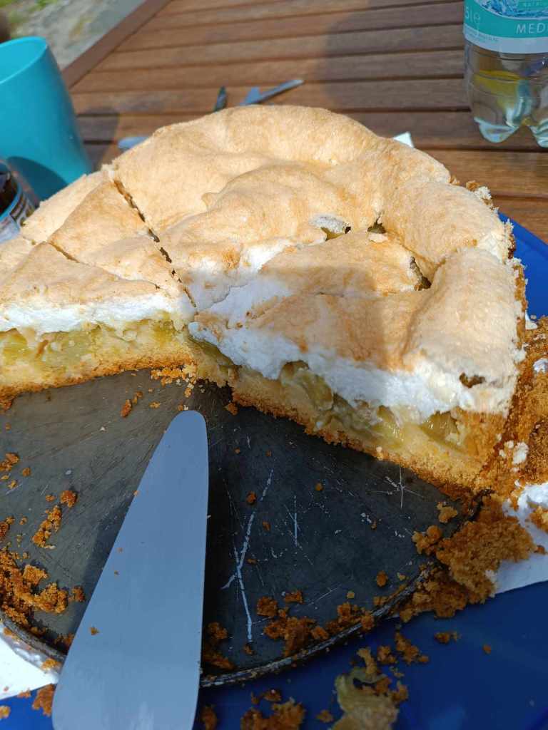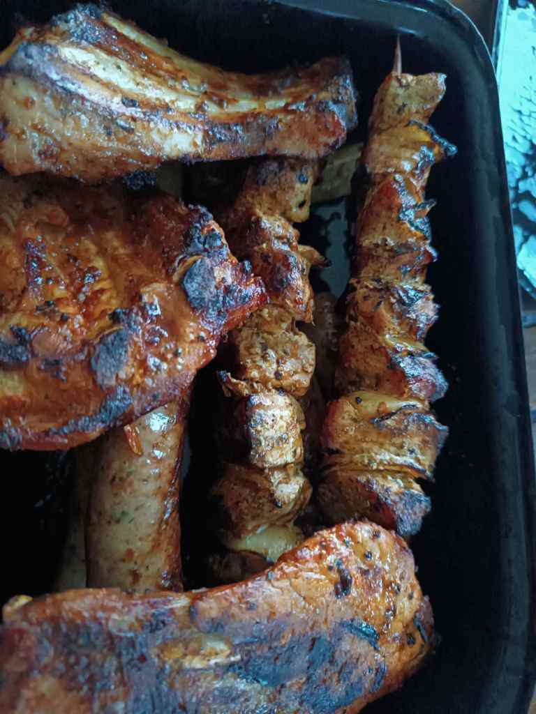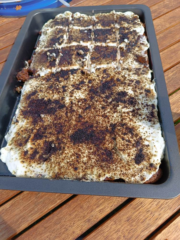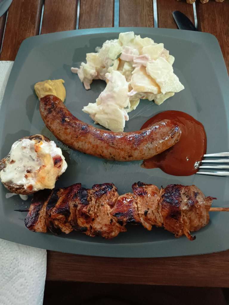 Nachmittags Kuchen (Mandarinenkuchen, Rhabarbertorte, Mooskuchen), abends gegrilltes (Würstchen, Schaschlik, gefüllte Champignons)