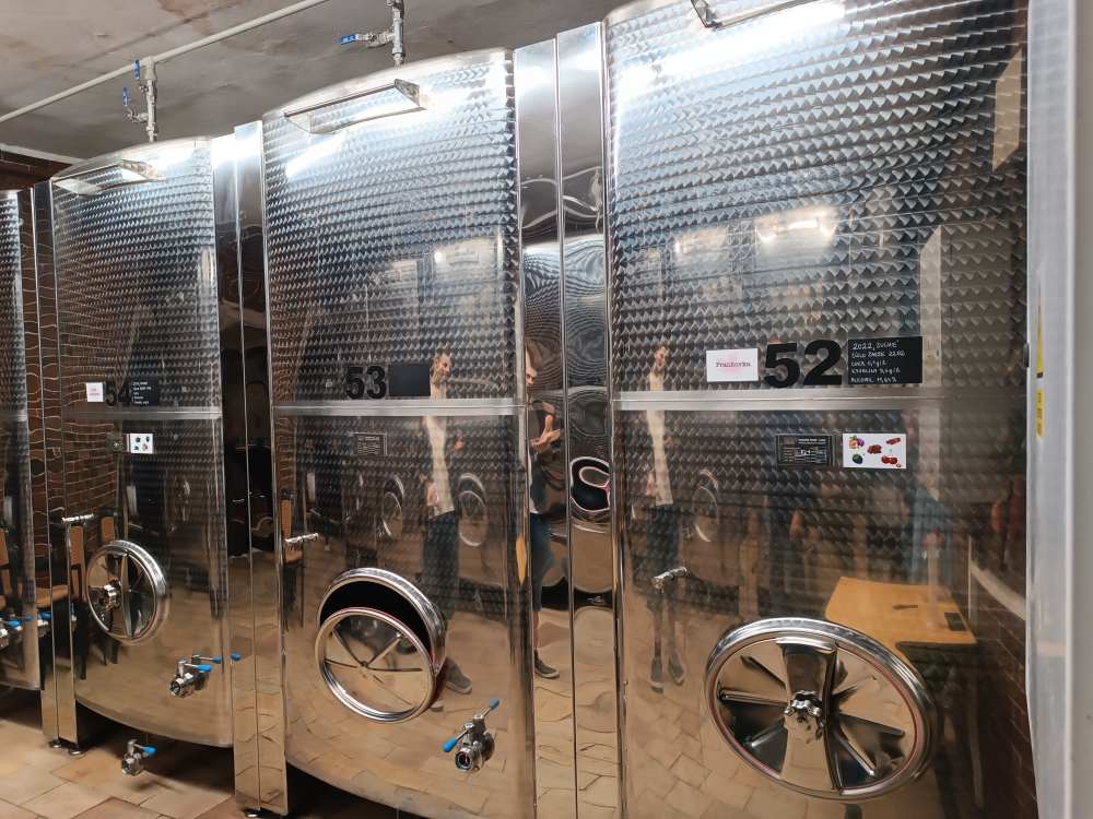 Zu einem Winzer gleich in der Nähe gefahren und Weine verkostet. Die Dame konnte kein Englisch, dafür ihr Bruder, den sie dann geholt hat. Sehr interessant, sie haben 45 ha, das ist schon recht ordentlich. Ich habe Sauvignon Blanc, grüner Veltliner und einen Rosé (der dann etwas süß, aber die Mitreisenden trinken eher süß) gekauft. Sehr gut, muss ich sagen. Der Typ, der sich in den Tanks spiegelt, war der Sohn des Hauses, der uns rum geführt hat