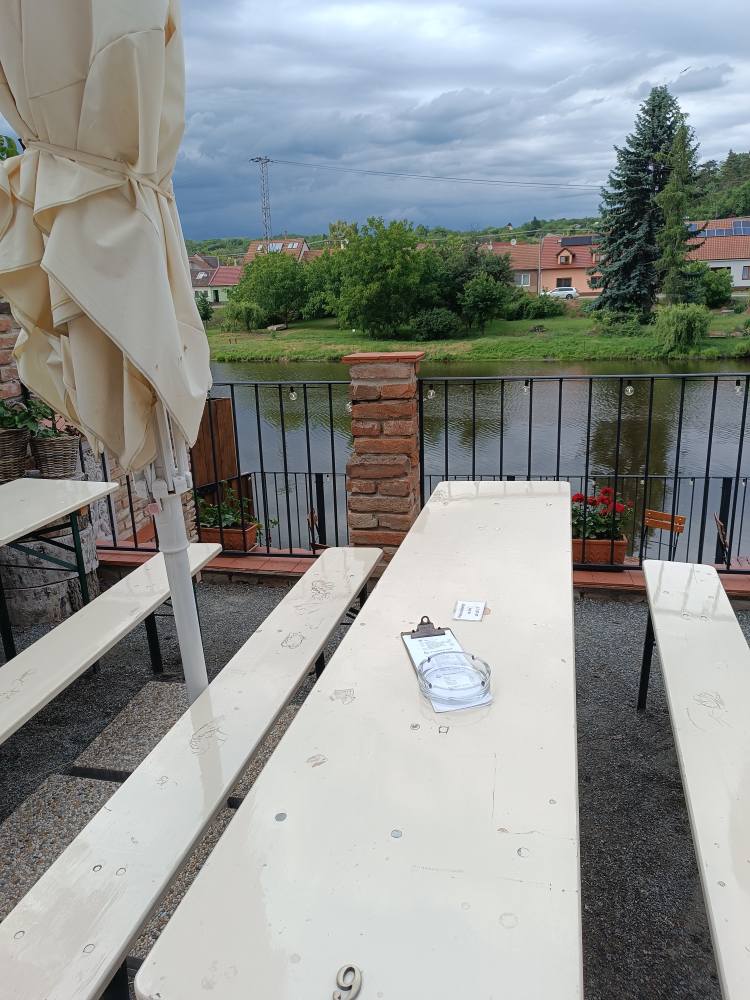 Realität: Statt einer Stange Zigaretten bekomme ich nur eine Schachtel, dafür kaufen wir 2 Kästen Bier. Am Fluss gibt es ein Café, da gehen wir hin. Sehr romantisch. Kuchen erst in 15 Minuten. Die Männer nehmen ein Bier, die Frau einen Cappuccino. Wir machen ein paar Fotos