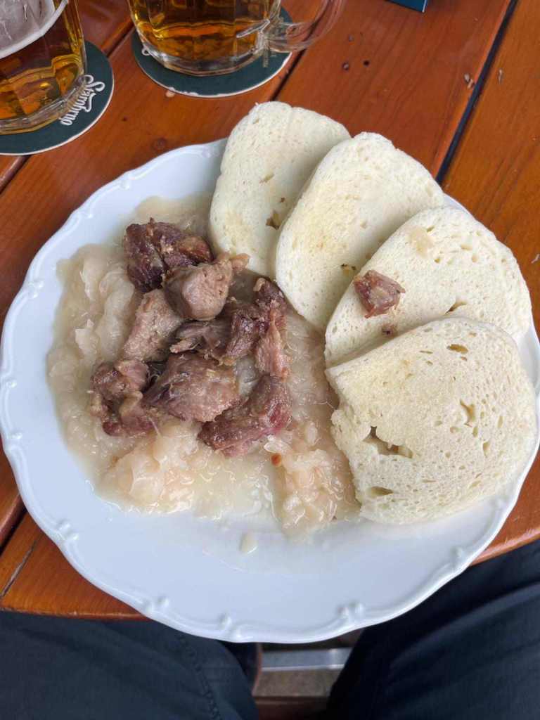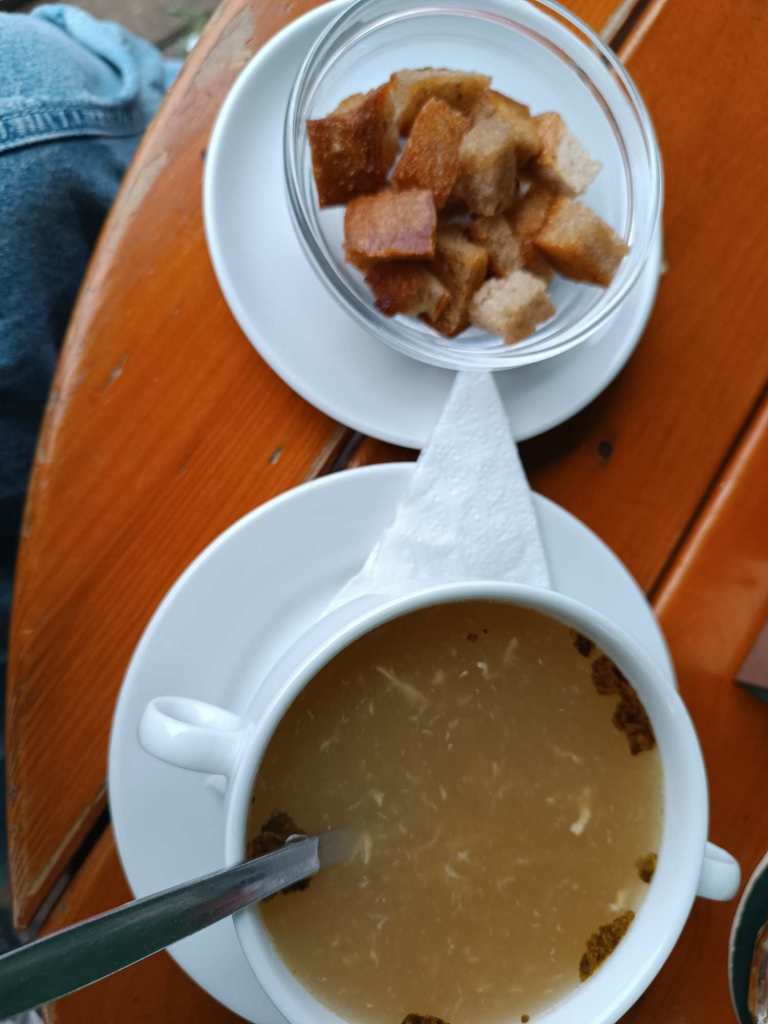 In der Dorfkneipe Knoblauchsuppe und Schweinefleisch mit Knödel und Kraut
