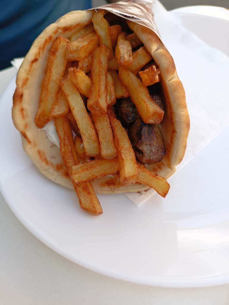 Der Chauffeur wollte griechisch, haben wir an einem kleinen Stand Lamm Suvlaki (er), gegrillten Feta Käse (ich) geholt