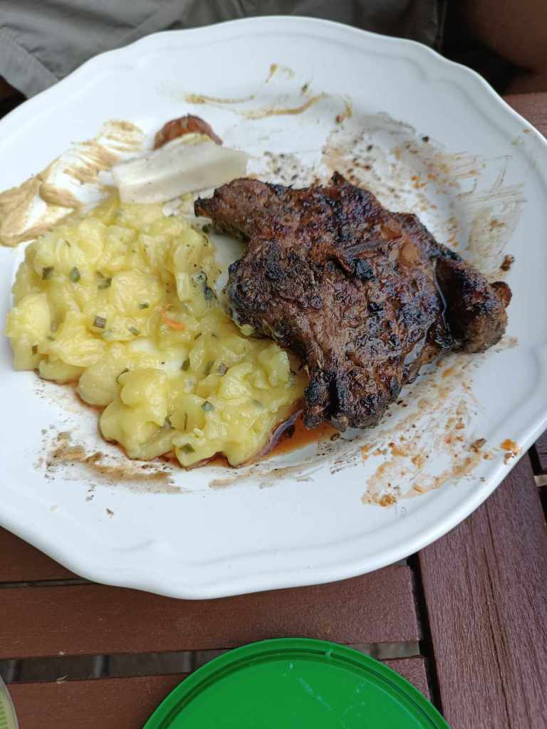 gegrillt – Lammkoteletts, Thüringer Würste, Kartoffelsalat, normaler Salat