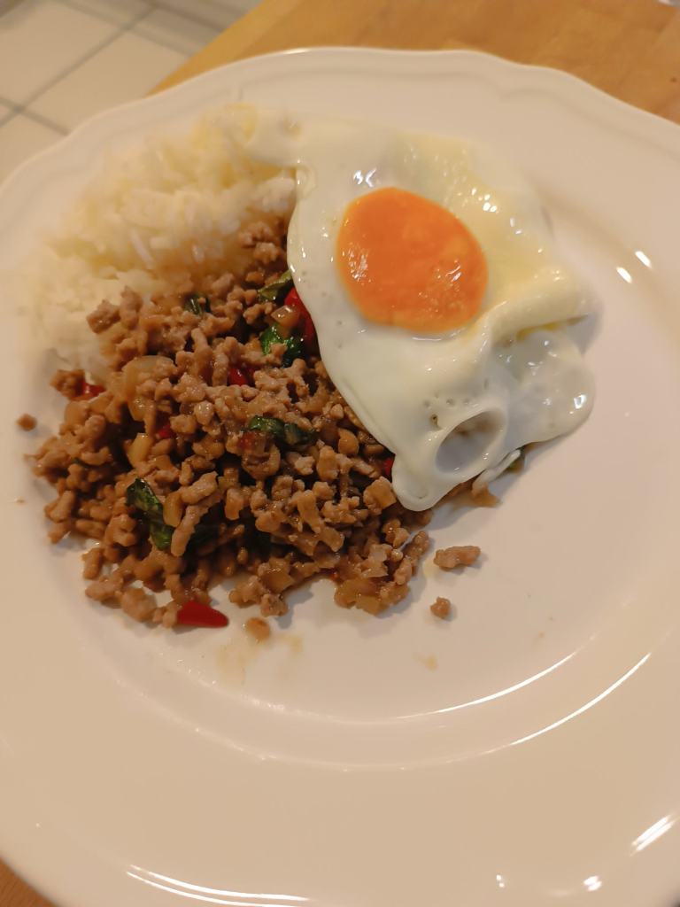 Thailändisch: Moo Pad Horapa – Gehacktes mit Thai Basilikum (und Reis und Spiegelei)