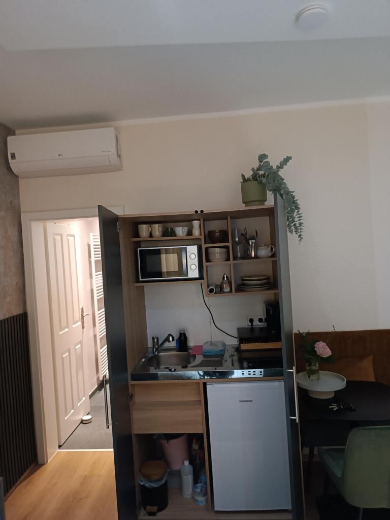 Nach Grünstadt, da habe ich ein Airbnb gemietet ( es ist sehr heiß und das Teil hat Klimaanlage 😊). Es gibt eine witzige winzige Küche, in einem Schrank