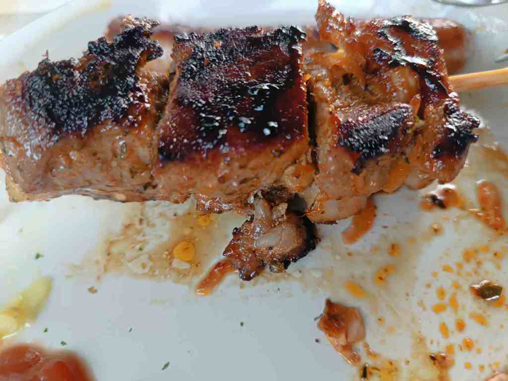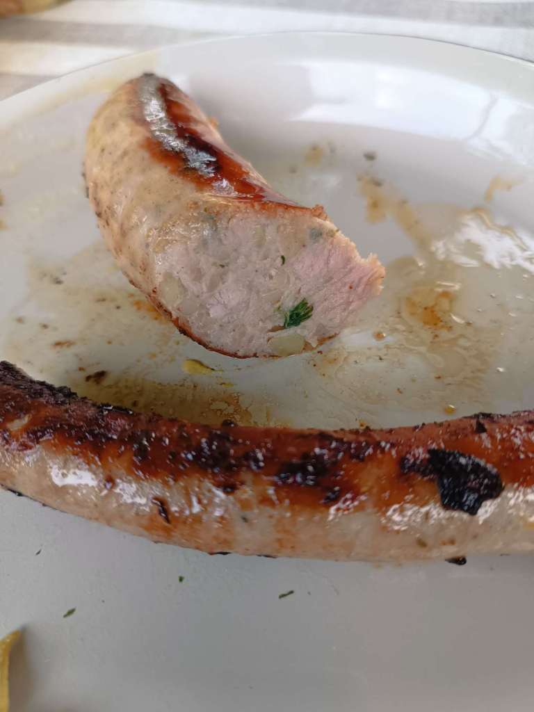 In Deutschland beim Metzger Grillzeug und Salate gekauft: fränkische Würste, Saumagenwurst, Fleischspieße Gyros Art