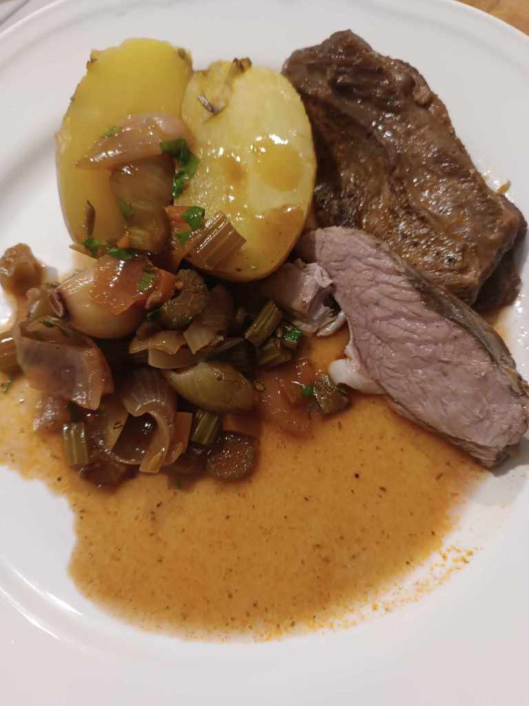 Nächste Woche bin ich in Spanien – darauf wollte sich der Koch einstimmen: Spanische Lammschulter und kanarische Kartoffeln. Ich hab eher wie ein Spatz gegessen, aber es war lecker und nun ist noch viel für morgen