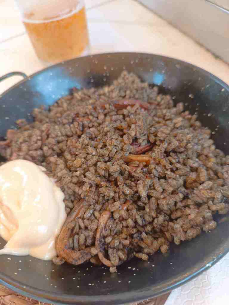 Gleich daneben gibt es einen Paella Stand und ich bekomme eine Paella negra – hatte ich bisher noch nie gegessen