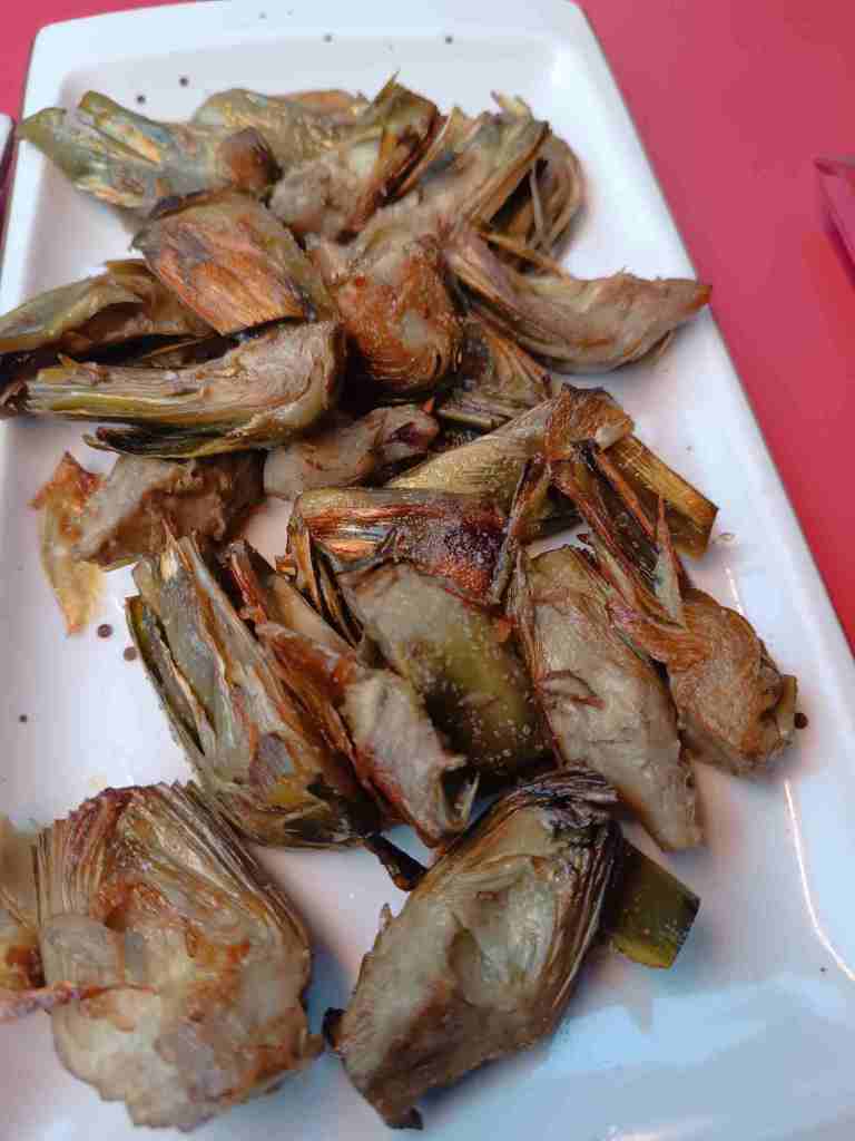 Nun bin ich wirklich fertig und brauche eine Pause. In einer Bar esse ich Morcilla, der Miturlauber Artischocken