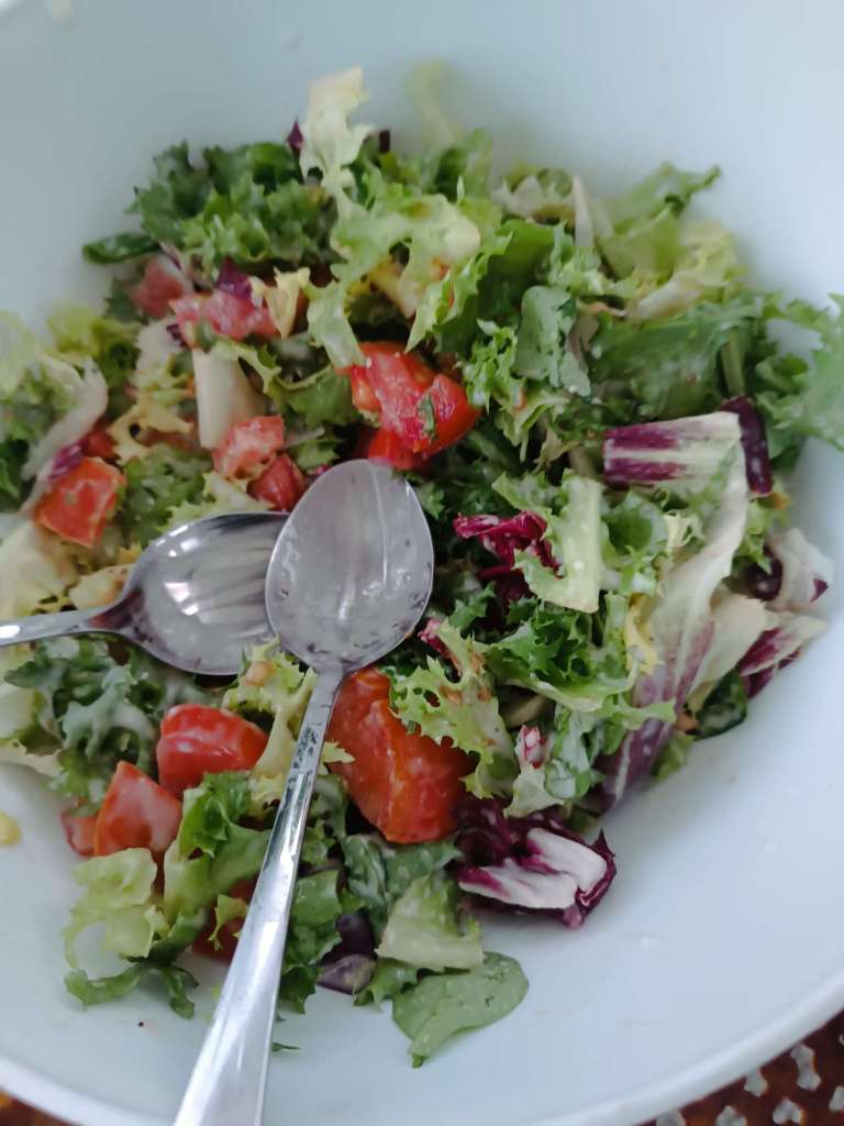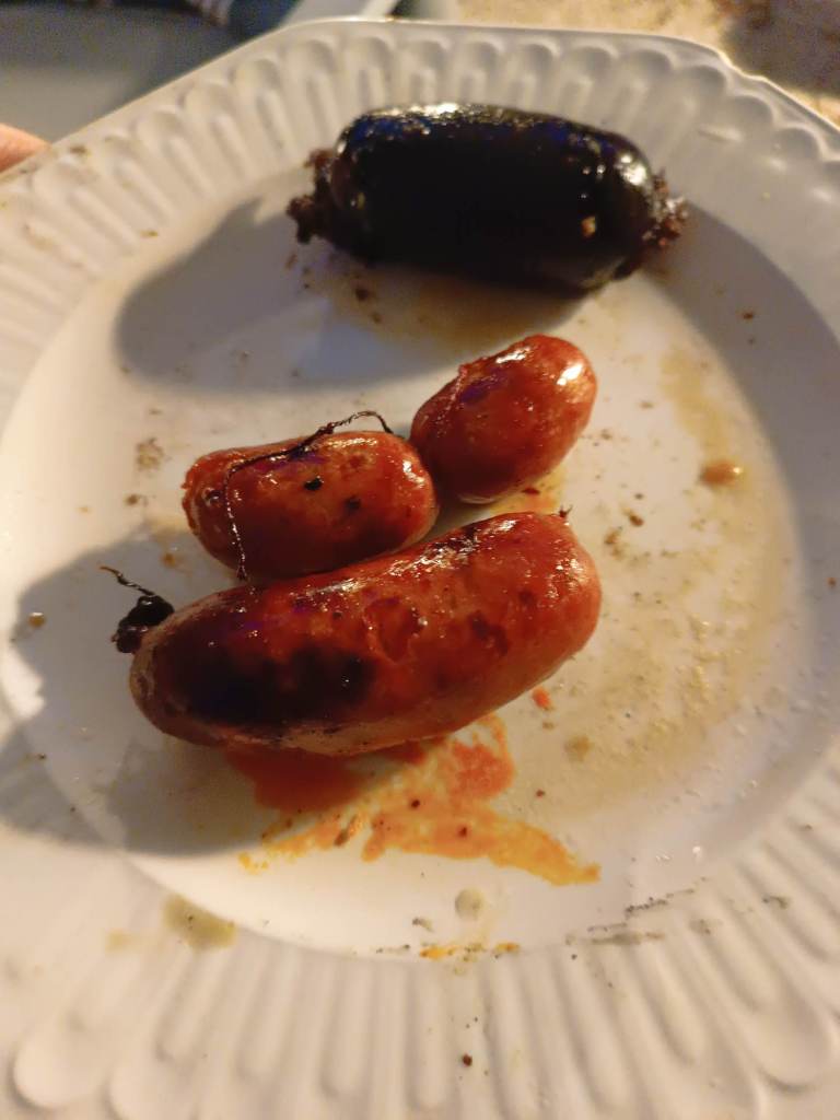 Nochmal gegrillt – Steak, Würstchen, Spieße. Dazu Salat . Alles auf Holzkohle, einer der Griller ist in ein Stückchen Holzkohle getreten, was runter gefallen ist, der Schuh ist markiert 😉