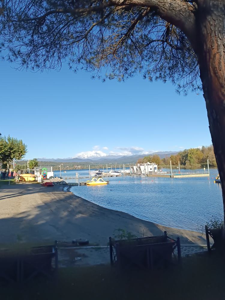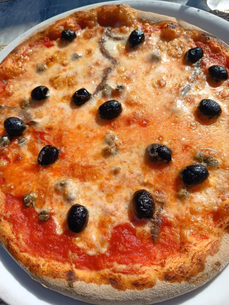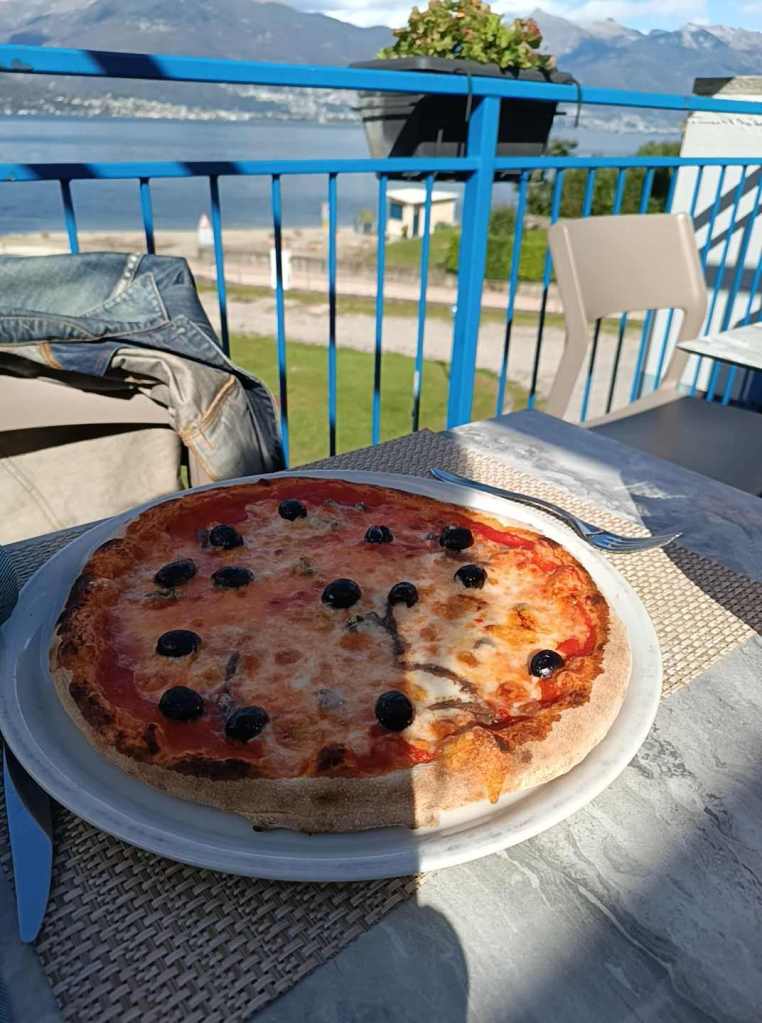 Mission Pizza wird nicht aufgegeben (ich habe eigentlich keinen Hunger mehr) und kurz vor der Grenze gibt es noch einen Laden, der auch Mittags Pizza hat. Ich habe eine Pizza Romana genommen, in der Sonne mit Blick auf den See kann man das gut essen