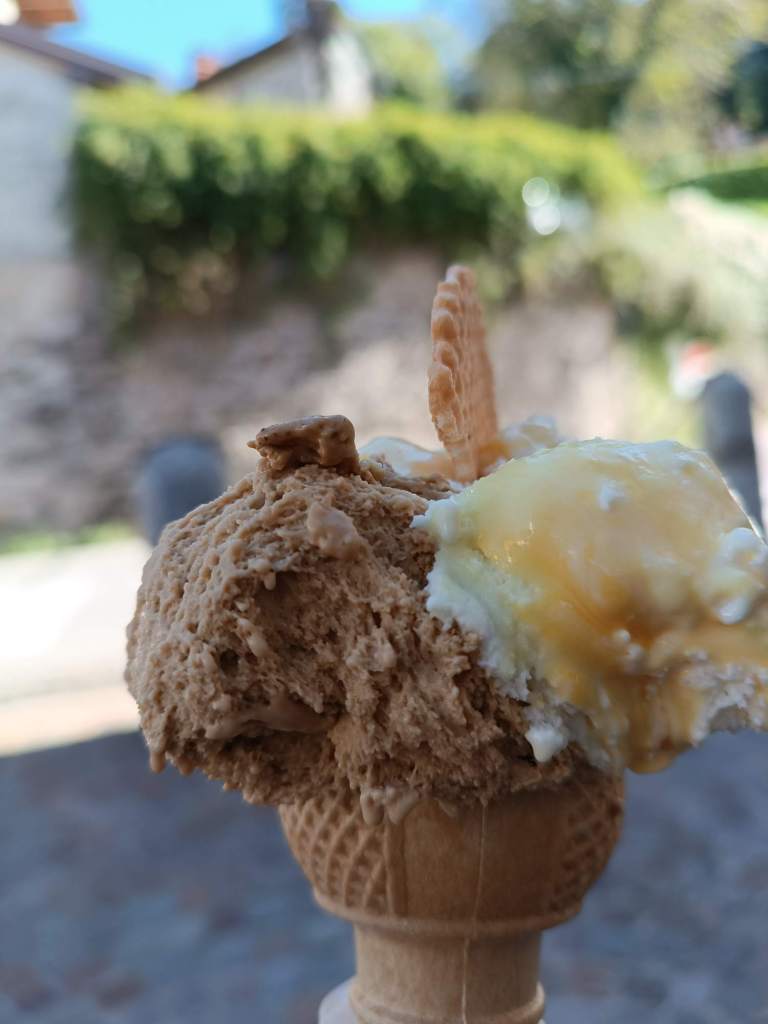 Nun geht es immer am Lago Maggiore entlang Richtung Norden, die Sonne scheint, der See glitzert. In Cero hole ich mir ein Eis – Kaffee und Orange. Total lecker