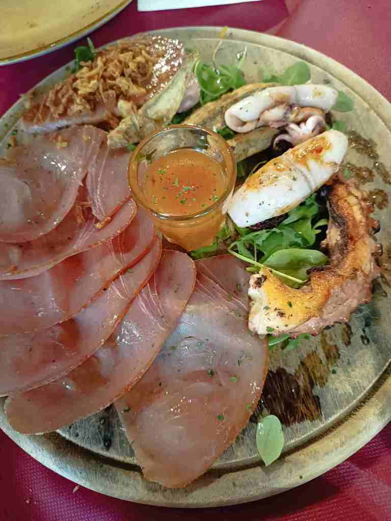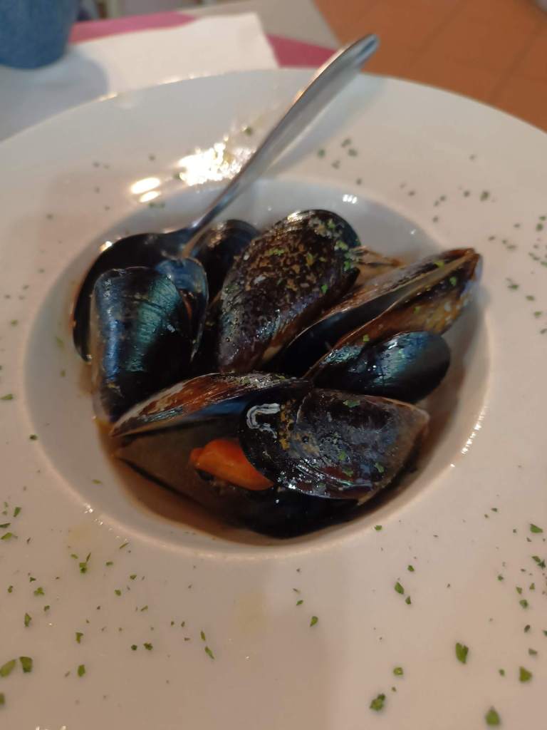 Der Fahrer hat jetzt Hunger, Pizza-Hunger. In Colmegna finden wir ein schönes Restaurant, erst bei der Bestellung erfahren wir, dass es Pizza nur abends gibt. Wir nehmen wenigstens die Vorspeise des Chefs – Muscheln und Fisch (Thunfisch Carpaccio, Pulpo, gebratener Fisch, frittierte Sardinen, …) Sooo gut