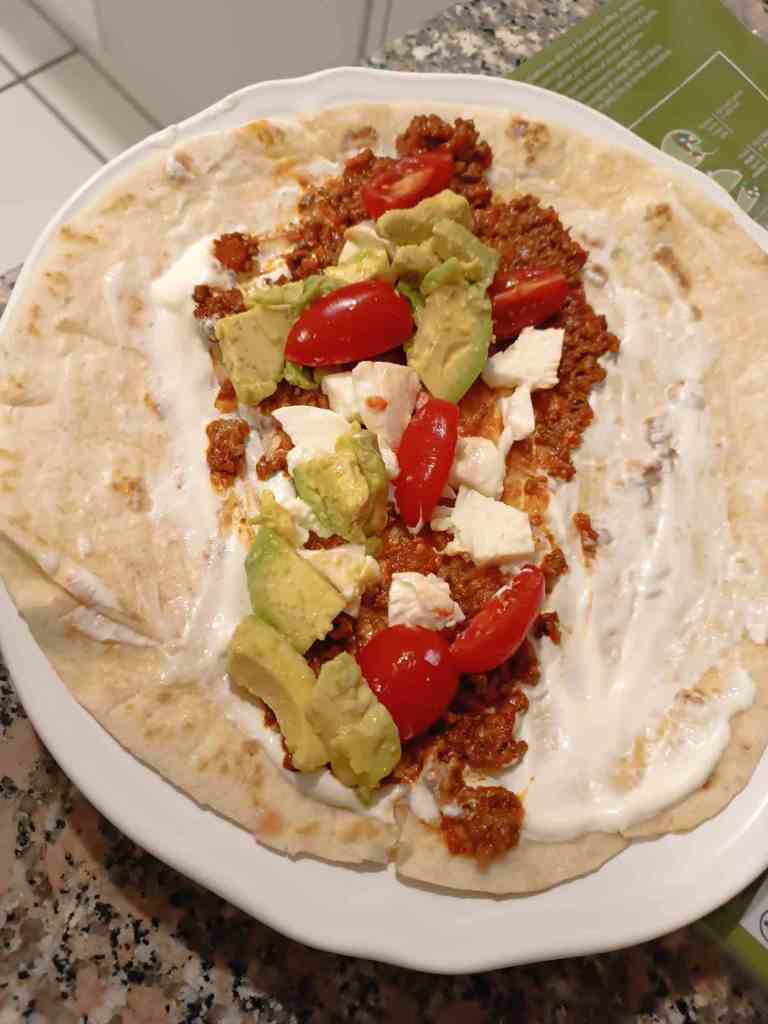 Tacos mit Bolognese, Mozzarella, Tomate und Avocado gefüllt. Hier noch uneingewickelt