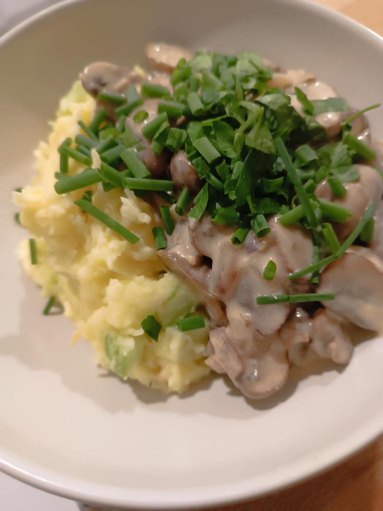 Kartoffel-Gurken Püree mit Champignon Sahne Sauce. Das Püree mache ich nicht wieder, die Gurken haben nicht wirklich gepasst. Und auf Wunsch eines Mitlesers – ein Foto 😉