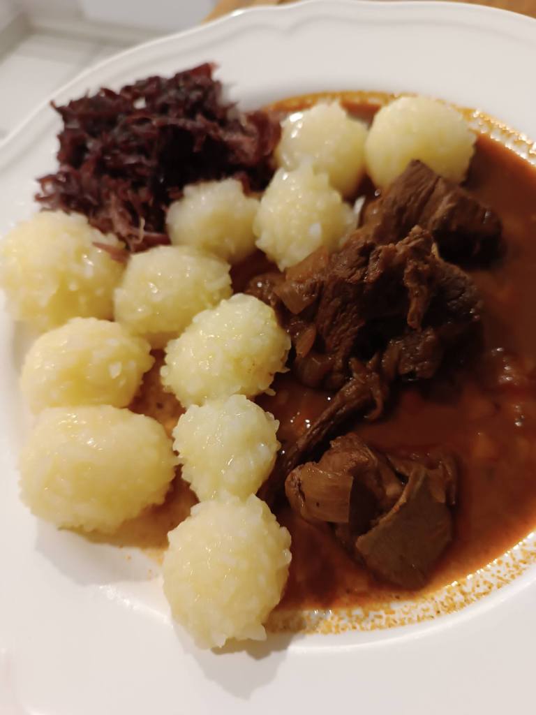 Gemischter Gulasch, kleine Knödel, Rotkohl