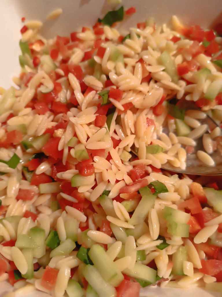 Schweinenacken Steak und Wurst vom Grill, dazu einen Salat aus griechischen Nudeln mit Tomate, Gurken, Paprika