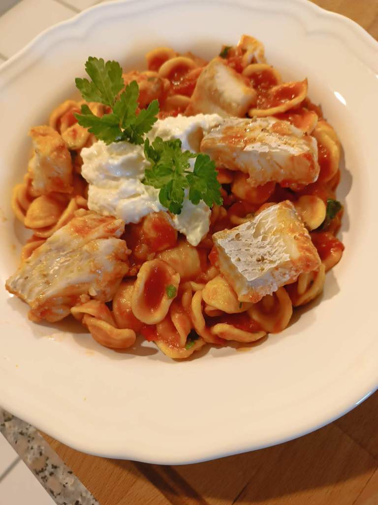 Fisch Tomaten Pasta. Das weiße ist Creme fraiche gemischt mit geriebenem Parmesan