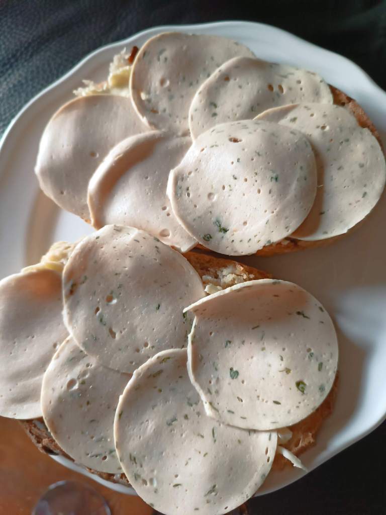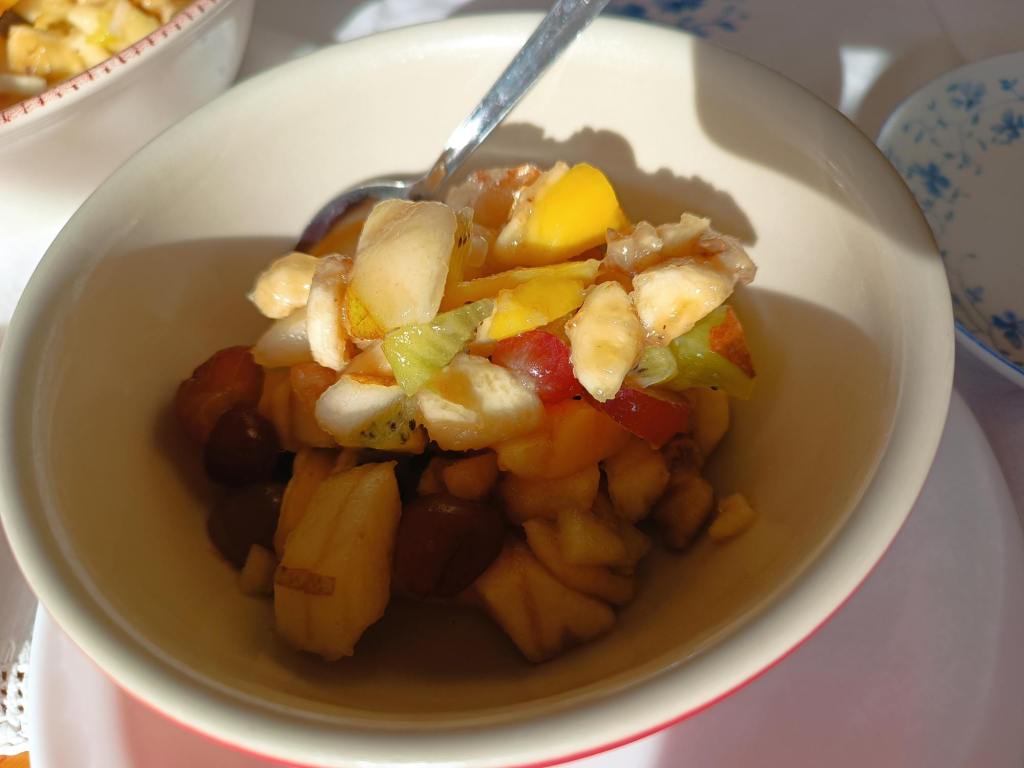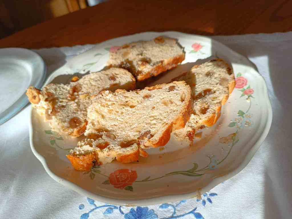 Zum Frühstück Obstsalat und Osterbrot. Abends Brot mit Gelbwurst
