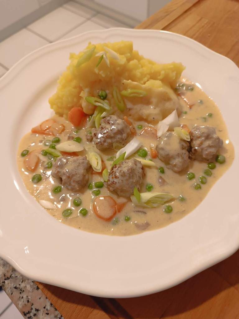 Wikingertopf mit Hackbällchen, Möhren, Erbsen – dazu Kartoffelstampf