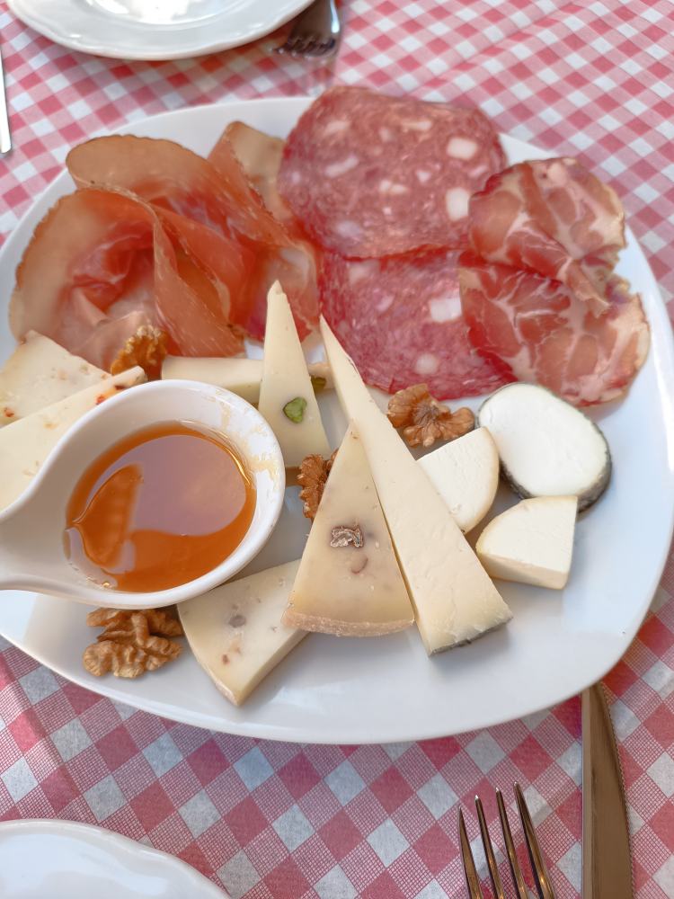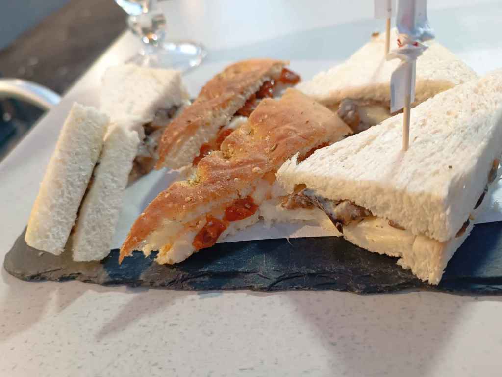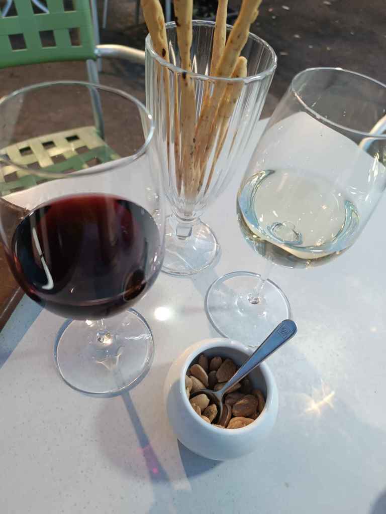 In einer Vinothek zum Wein eine Käse/Wurstplatte. In einem anderen Kaffee zum Wein Häppchen, Grissini und geröstete Mandeln bekommen. Eis.