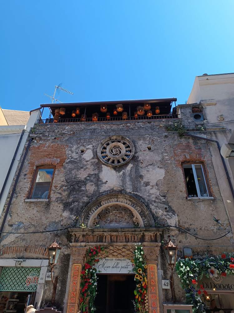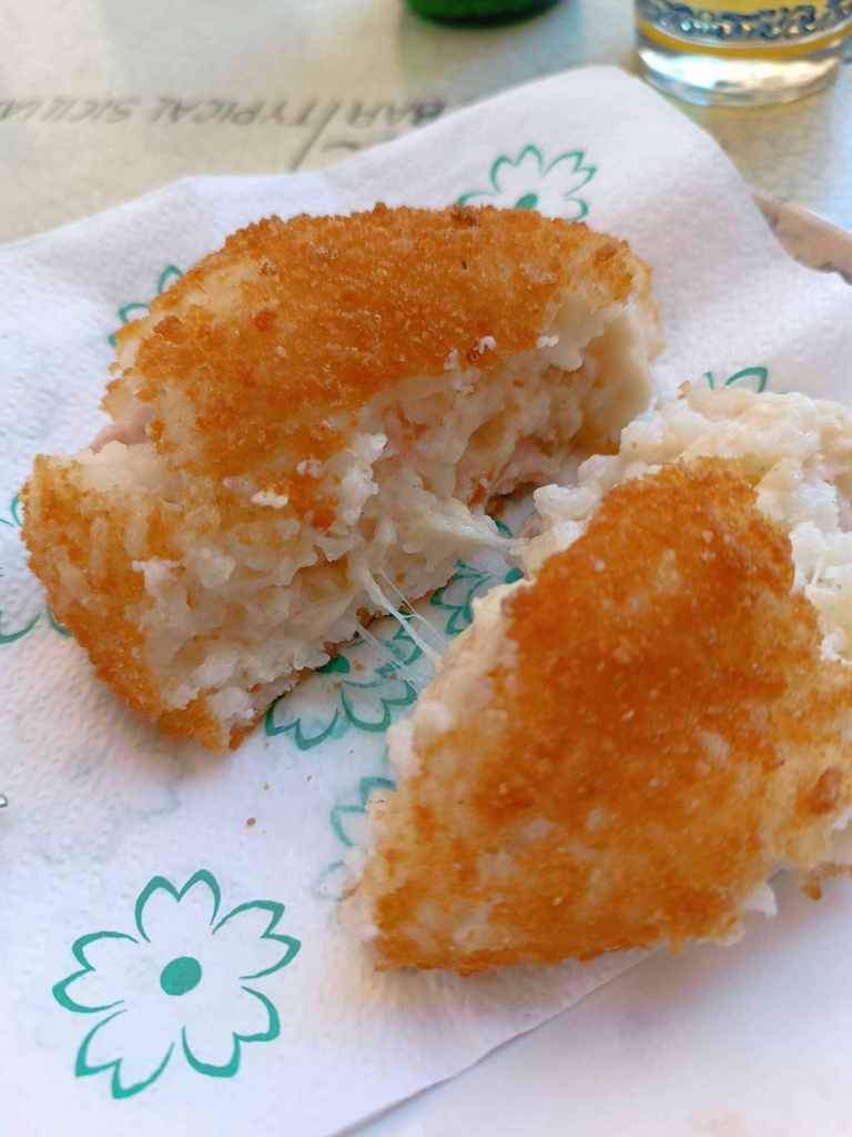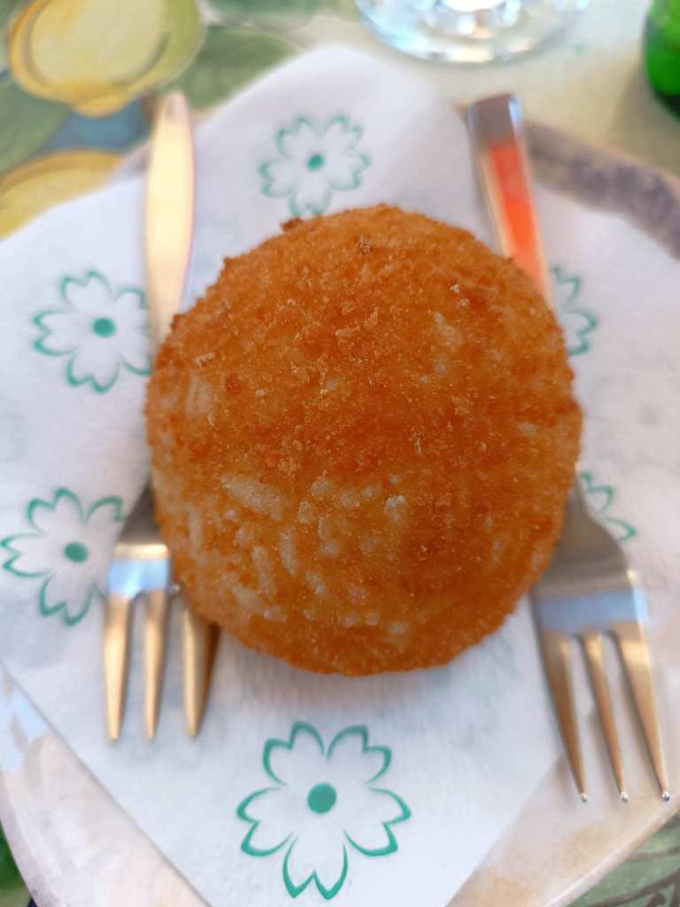 In Taormina einen Arancino (gefüllt mit Schinken und Käse), abends auf dem Campingplatz Fleischspieße gegrillt, da habe ich jetzt kein Foto