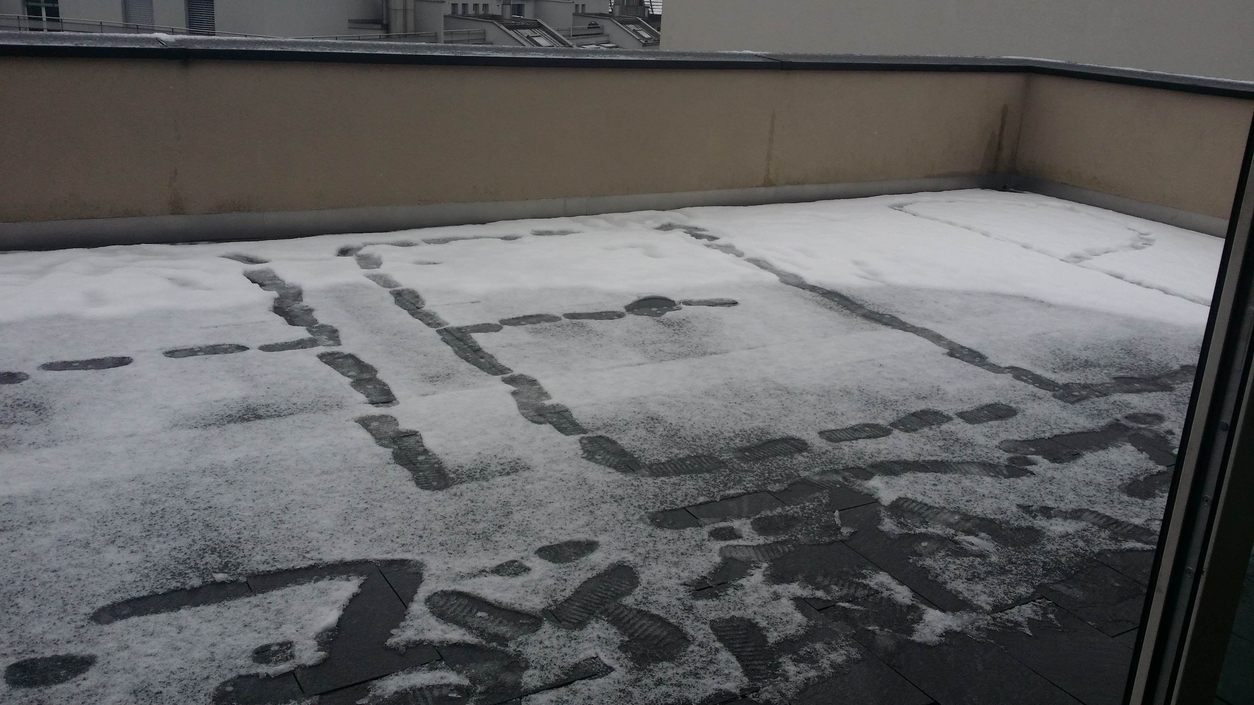 Unser Bürogebäude hat eine Dachterrasse und zwar, so wie Dachterrassen im allgemeinen sind, nicht überdacht. Da es die ganze Zeit schneit, liegt jetzt dort Schnee. Und jemand (oder einige) hat HELP in den Schnee getrampelt. Das ist lustig! Hilft wahrscheinlich nicht, hat mich aber zum lächeln gebracht. Also doch geholfen.