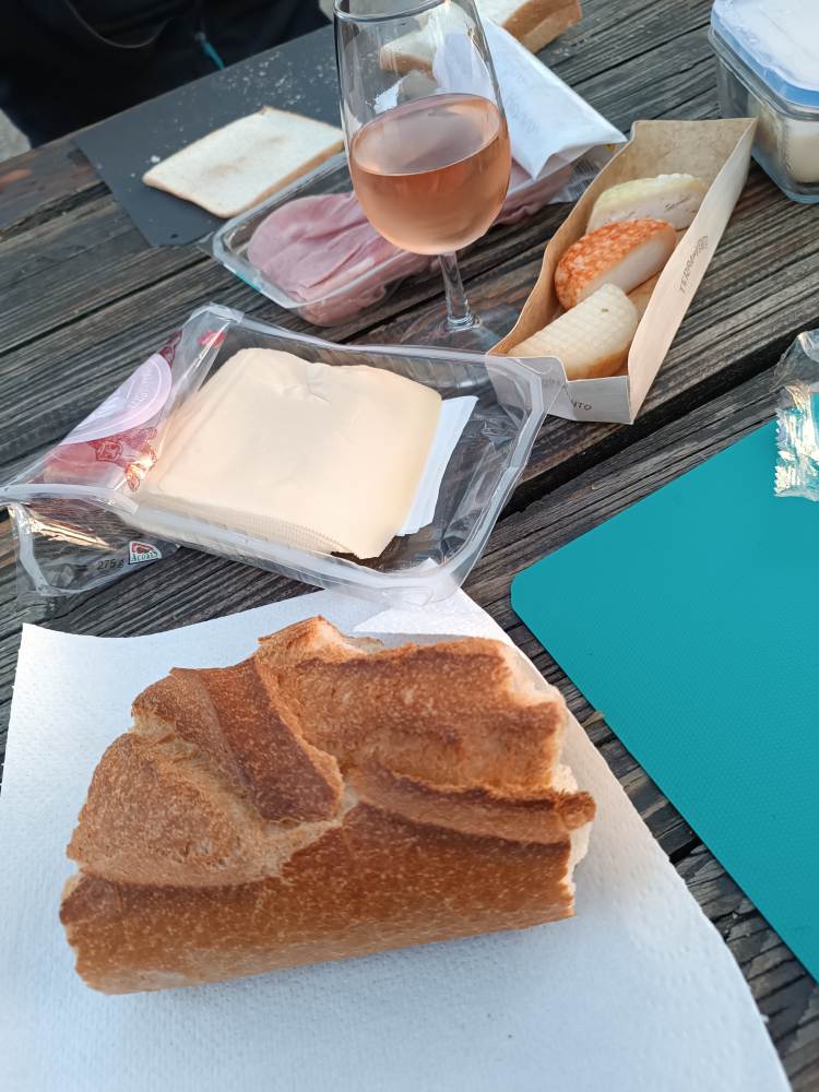 450 km später lande ich in Tanus, ein kleines Dorf mit offiziellem Stellplatz. In der einzigen Bar des Dorfes trinke ich ein Bier und kann die Restbestände der Baguettes aufkaufen – genau ein halbes. Ich spaziere kurz durchs Dorf und sehe ein witziges Bild. Dann setze ich mich an einen Picknick Tisch des örtlichen Bouleplatzes und dann wird gegessen, was halt so im Kühlschrank spazieren gefahren wurde – Baguette, Schinken, Käse. Dazu Rosé. Es ist immer noch warm (20:25 26 Grad), ich beschwere mich nicht.