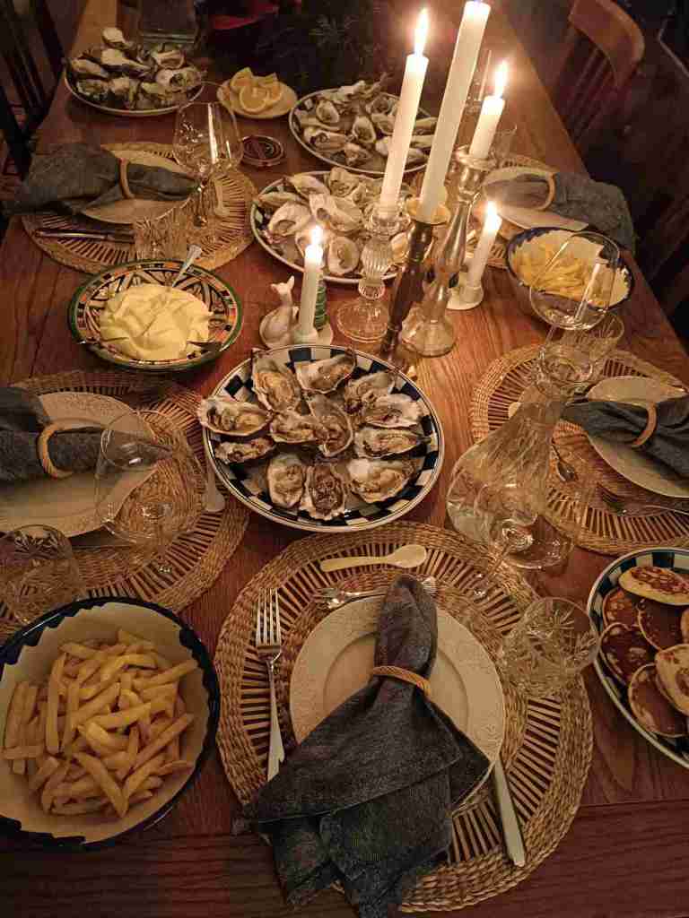 Dann weiter und gegen 18:00 komme ich an. Wir bereiten alles vor und dann sitzen und es wird geschlemmt und geniessen es, dass es uns gut geht. Gegessen haben wir die Austern und Blinis und Kaviar, getrunken Champagner