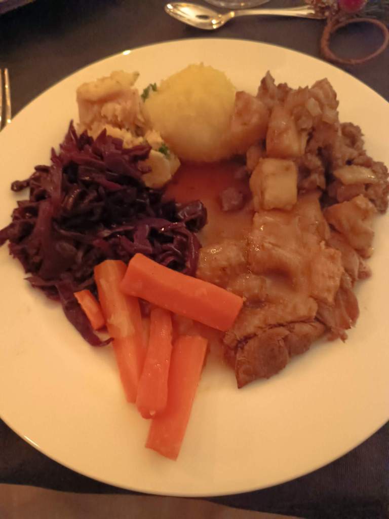 Gans mit Semmelknödel, Kartoffelklöße, Möhrengemüse, Rotkraut, Füllung (u.a. Kastanien), Fenchel Orangen Salat. Zum Dessert: Tiramisu und Mousse au chocolate