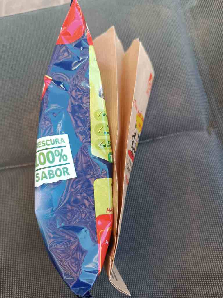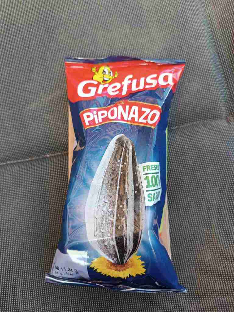 An der Tanke habe ich auch Pipas gekauft (gesalzene und geröstete Sonnenblumenkerne mit Schale). Lustig ist, dass sie jetzt an der Tüte eine Papiertüte für die Schalen haben