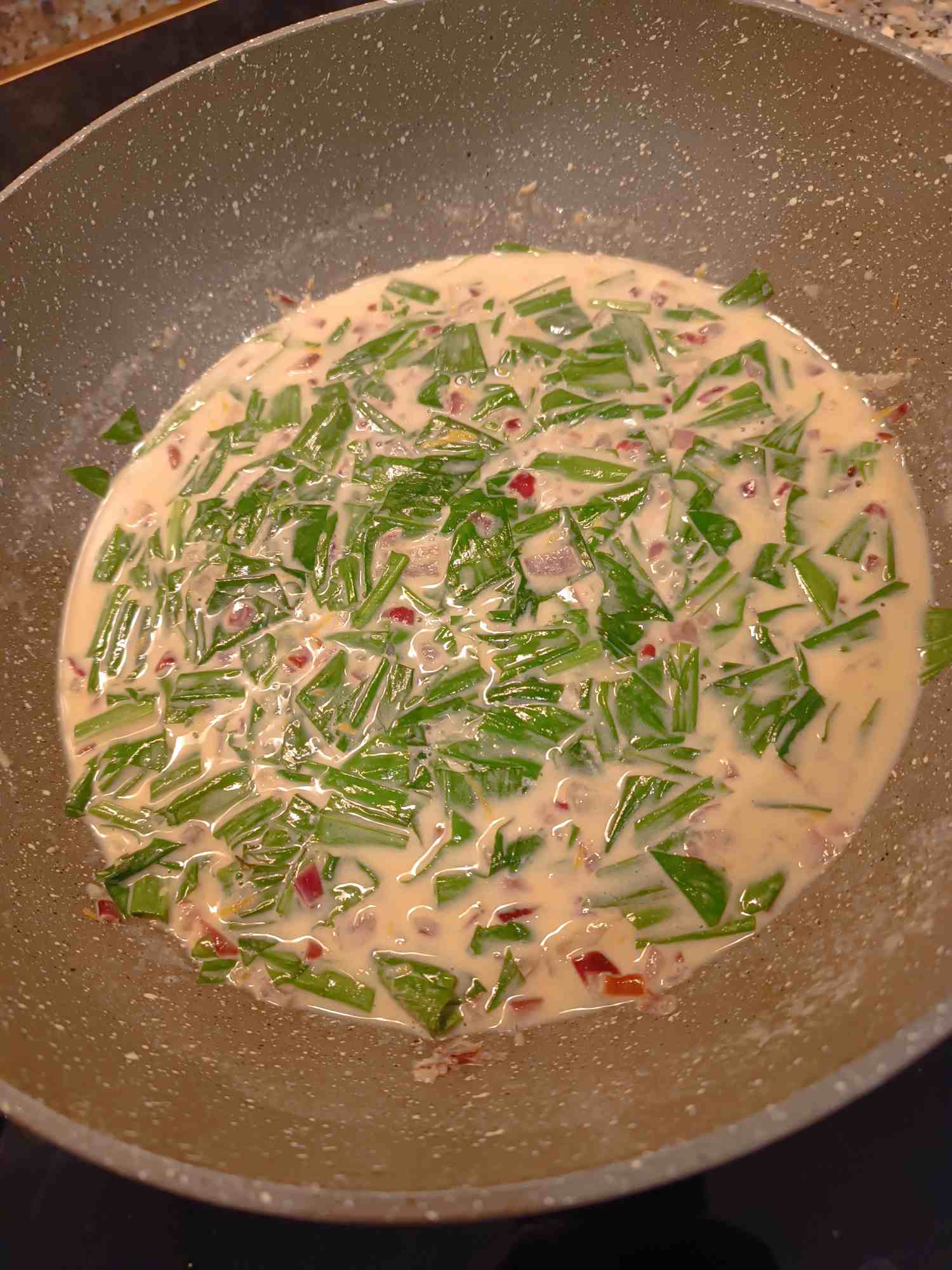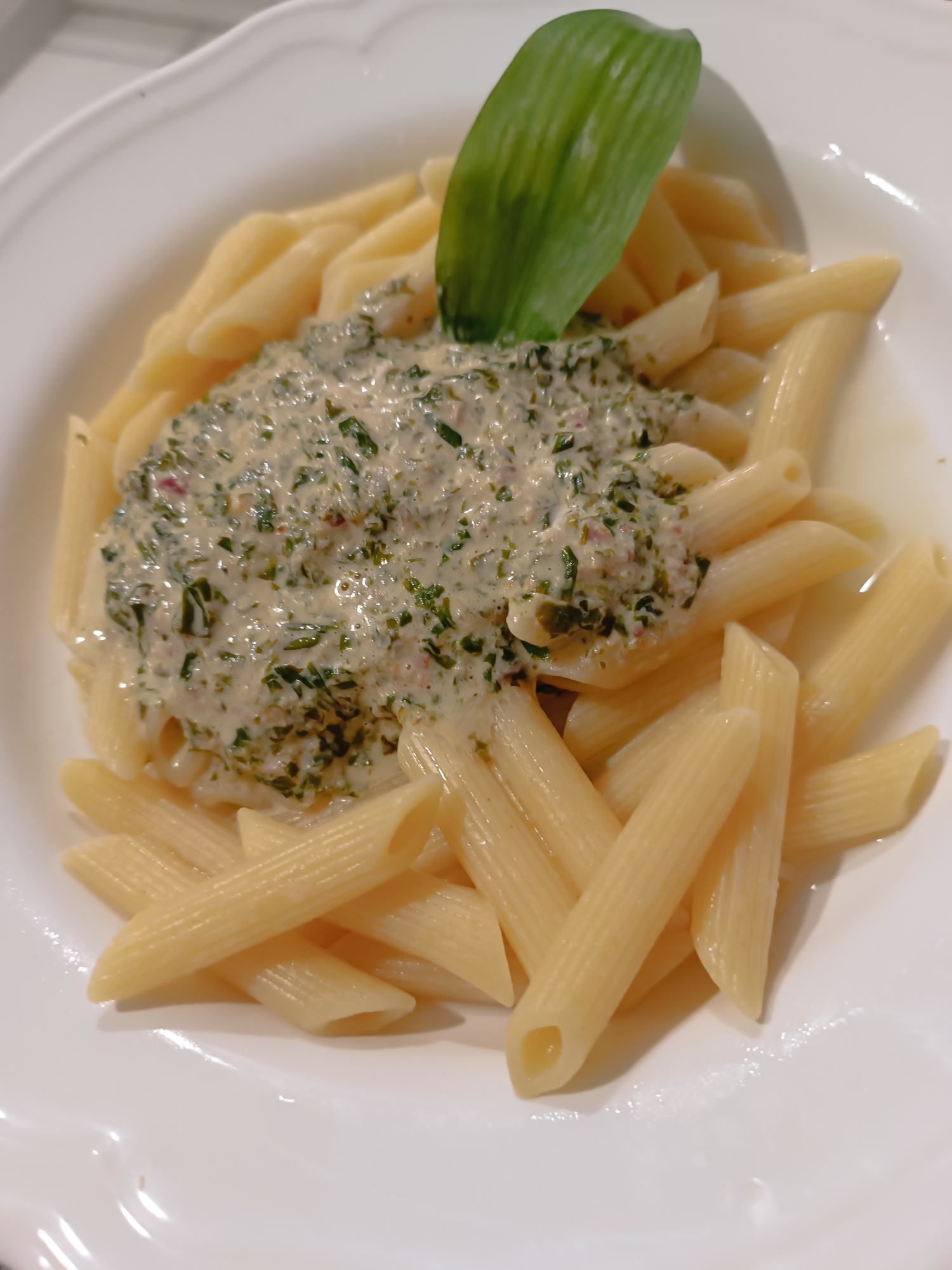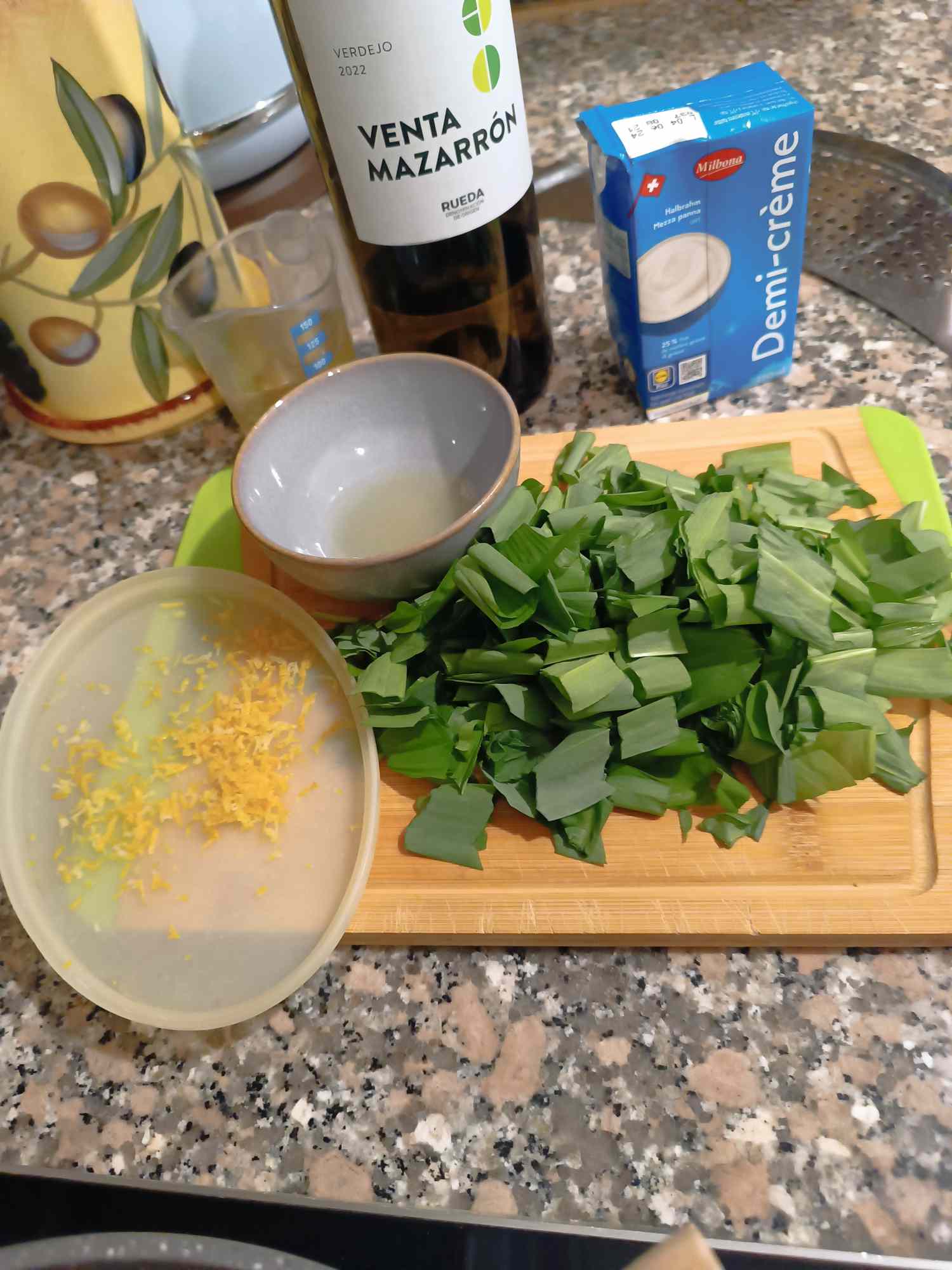 Zu Hause wartet der gestern angesetzte Pizzateig, da kommt Zeug drauf, u.a. Bärlauch (bevor der mir alles zu wuchert), dann alles in den Pizzaofen und dann wird die gegessen